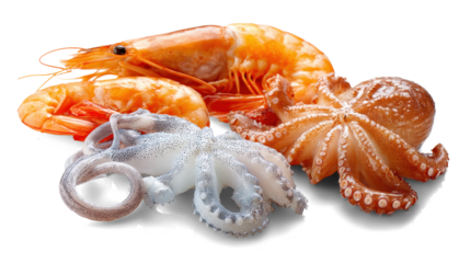 Shrimps, octopus and squid on white background