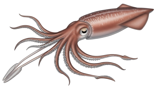 A detailed view of a squid with elongated body and long tentacles. The squid is displayed on a transparent background, showcasing its unique features.