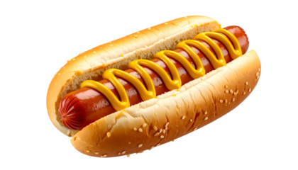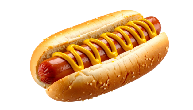A hot dog in a bun with mustard and relish squiggles, perfectly centered and isolated on a pure white background for a classic graphic.