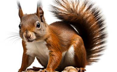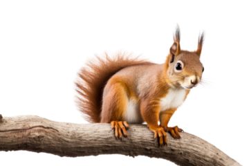 A curious red squirrel perched on a tree branch, its bushy tail elegantly fanned out, with bright eyes and alert posture, isolated on white background