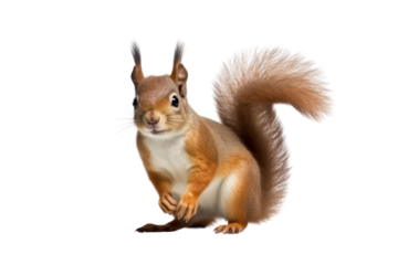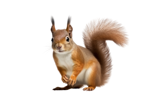 A red squirrel standing on its hind legs with its tail curled around its body,, isolated on white background