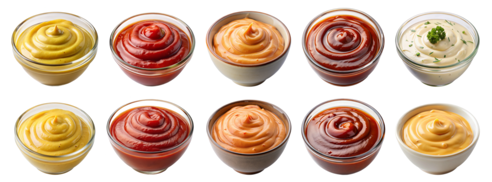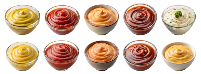Assorted Sauce Collection in Glass Bowls – Transparent PNG of Various Condiments for Food Photography, Menu Design, and Culinary Marketing