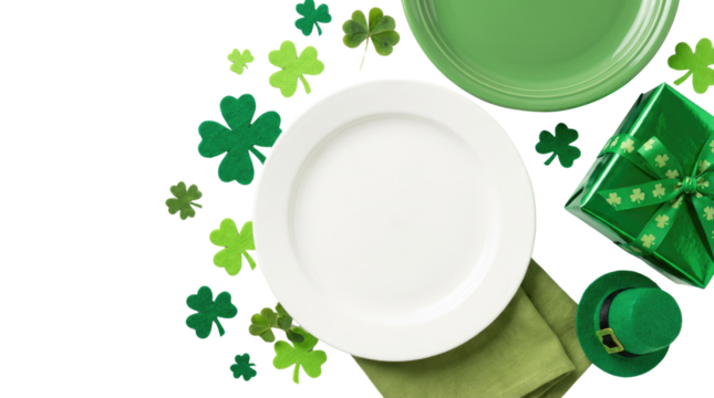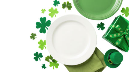 Happy st patricks day still life featuring green shamrocks, plates, and a napkin on a white transparent background and plain white background