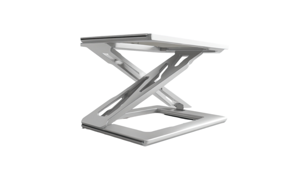 An under-desk ergonomic footrest with curved textured platform, adjustable tilt, and stable base, isolated on transparent background.