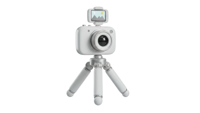 A 3D rendering of a camera on a tripod, capturing a scene from a stable viewpoint.