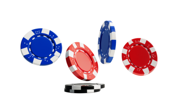 Colorful casino chips in red, blue, and black, stacked and scattered, evoke excitement