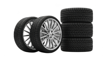 Stack of car tires and alloy wheel isolated on a transparent background automotive