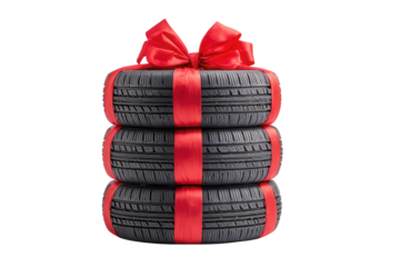 High quality photo of a stack of tires wrapped as a gift with red ribbon isolated on transparent background