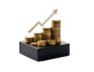 3D graphic showing gold coins stacked atop a block with a percent symbol and upward arrow