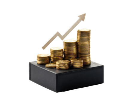 Golden coins stacked with upward arrow isolated on transparent background