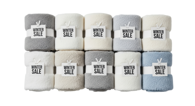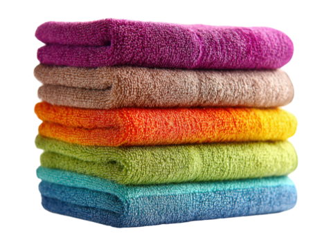 Stack of folded knitted sweaters in cream black pink brown grey and beige colors isolated on a transparent background