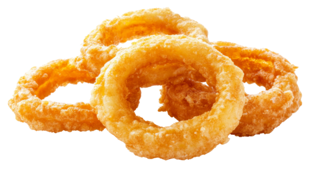 A vibrant arrangement of golden, crispy onion rings artfully stacked on a transparent background, perfect for food photography