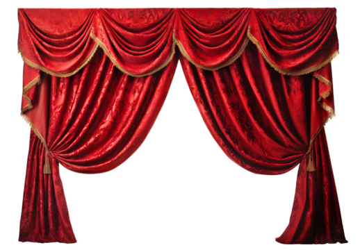 Luxurious red theater curtains with tassels, cut out - stock png.