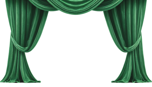 Luxurious Emerald Green Velvet Curtains Draped Open. A high-quality full studio shot of a pair of emerald green velvet curtains draped open in a dramatic fashion
