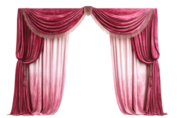 A majestic combination of pink and red velvet curtains forming a bold arch entrance, exuding elegance and grandeur, ideal for setting the stage for a high-class performance or event.