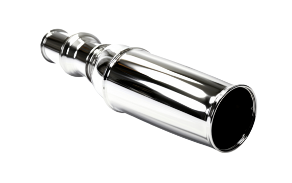 A photograph showcasing a stainless steel exhaust pipe. on White or PNG Transparent Background.