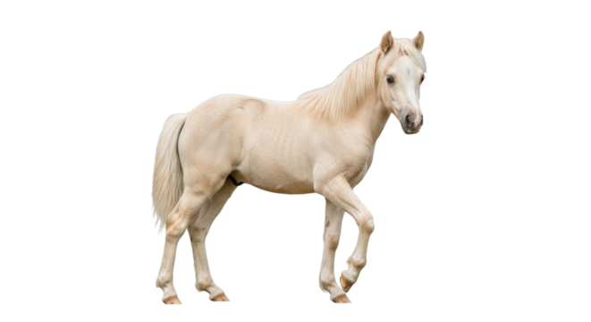 Isolated palomino horse walking, light-colored horse with blond mane and tail in motion