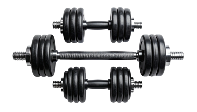 Assortment of black dumbbells and barbell isolated on black background for fitness use
