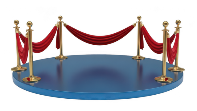Blue display podium with gold stanchions and red velvet ropes on transparent background