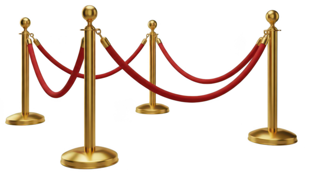 Elegant golden stanchion rope barrier with red velvet rope isolated on transparent background