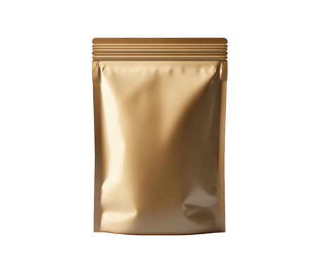 Sleek stand up pouch packaging in shiny gold finish, perfect for various products. Ideal for food, snacks, or cosmetics, this versatile design enhances shelf appeal