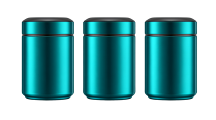 Three turquoise vacuum insulated bottles stand isolated on a transparent background.