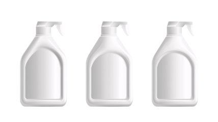 Three white plastic spray bottles stand against a dark backdrop, ideal for product mockups and cleaning supply visuals.