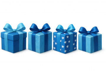 Blue gift boxes with ribbons and bows standing in a row, featuring star pattern, representing celebration and presents