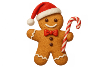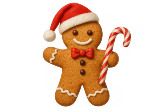 Gingerbread man wearing santa hat and red bow tie holding candy cane, standing festive christmas cookie with happy face