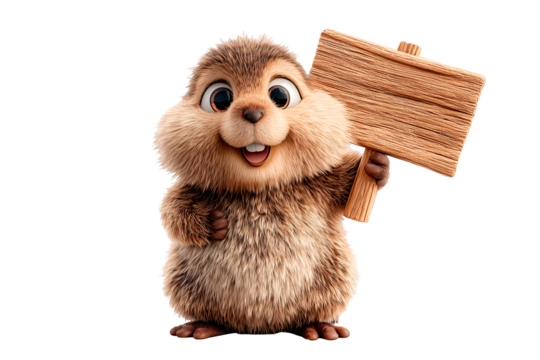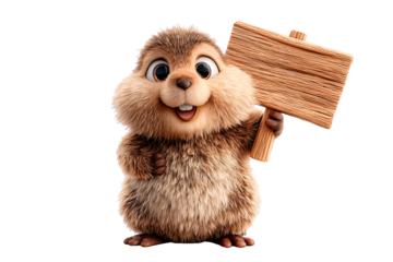 Cute cartoon groundhog character standing with a sign in its paw in a bright and colorful setting