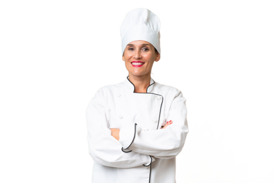 Middle-aged chef woman over isolated background with arms crossed and looking forward