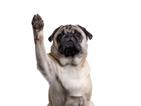 Playful pug dog standing on hind legs with front paw raised on transparent background