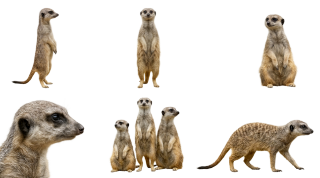 group of meerkats in various poses, standing guard, sitting, and a detailed profile isolated on a transparent background