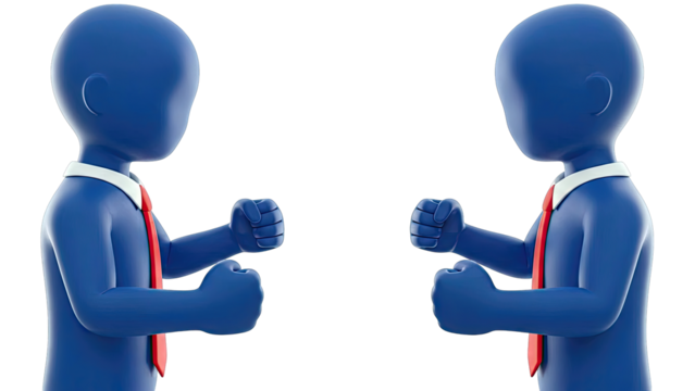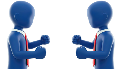 Two Blue Figurines Facing Off, Clenched Fists