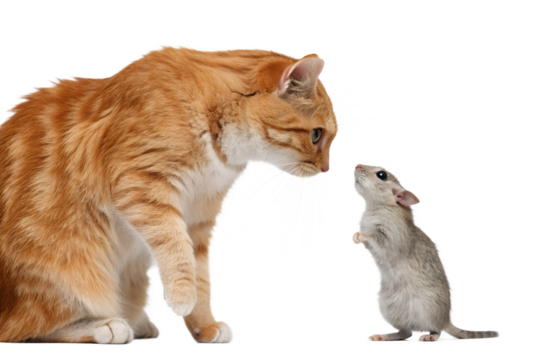 Cat and Mouse: A captivating tableau unfolds as a majestic ginger cat and a curious little mouse engage in an intriguing stare-down.
