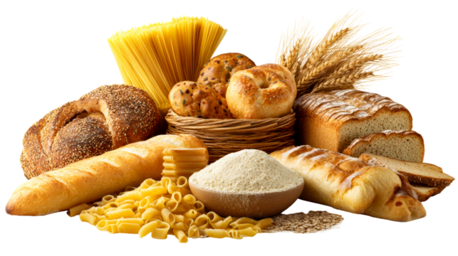 Abundant assortment of bread loaves, pasta, flour, and wheat stalks for bakery and foodrelated projects presented on a white background