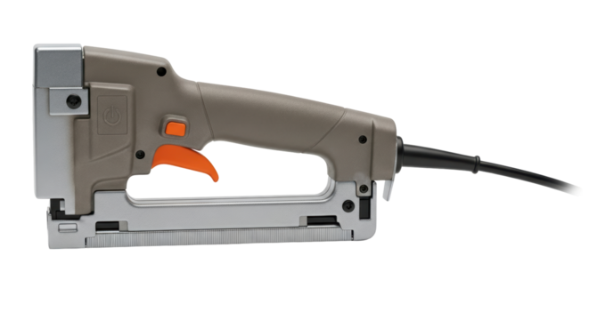 Pneumatic stapler with a bottom-load magazine for upholstery work.