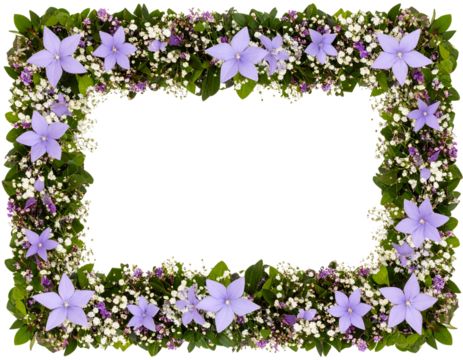 Rectangular Floral Frame Made of Star Flowers and Greenery, Transparent PNG.