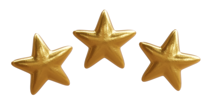 Three golden stars isolated on white, transparent. Rating and ranking sign symbol