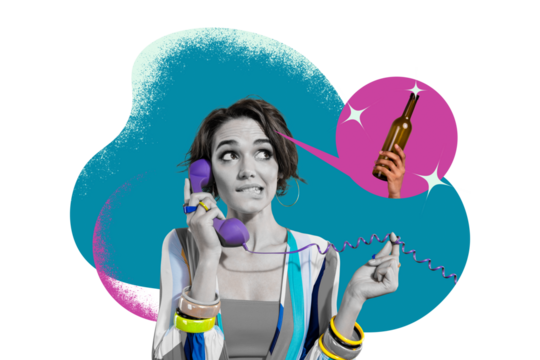 Composite photo collage of pretty girl bite lips hold telephone handset call dream alcohol beer bottle isolated on painted background