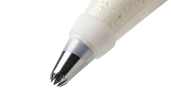 Closeup of a pastry bag with a star tip isolated on transparent background, filled with white cream, ready for decorating cakes and desserts png