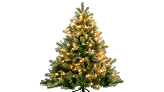 Realistic artificial Christmas tree with lifelike branch tips, pre-strung warm lights, and sturdy metal stand, retail-ready, isolated on white background