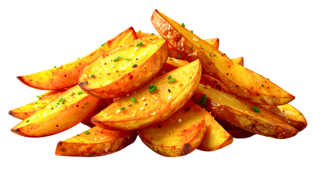 A pile of golden-brown, crispy potato wedges, seasoned and fried to perfection, isolated on transparent background