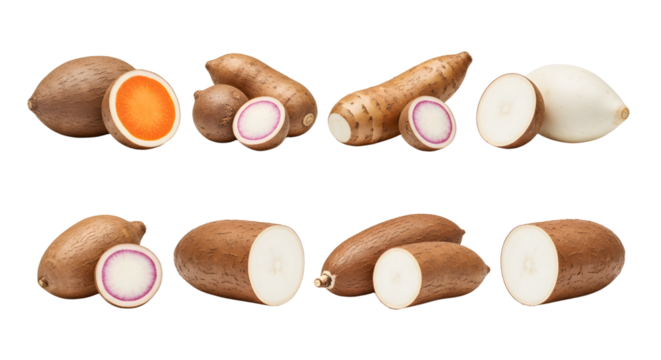 Fresh whole and sliced African yam tubers isolated on white background, healthy starchy root vegetables ideal for cooking and traditional dishes