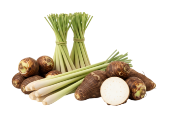A collection of fresh taro roots and bundles of aromatic lemongrass stalks isolated on transparent background
