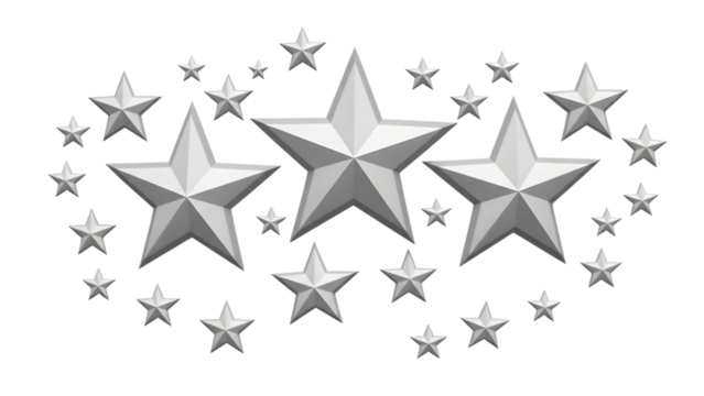Collection of metallic silver stars of various sizes arranged in a circular pattern isolated on a transparent background