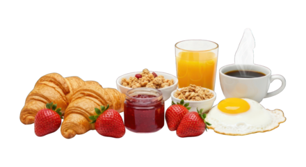 Breakfast spread croissants, strawberries, jam, cereal, juice, coffee, and egg
