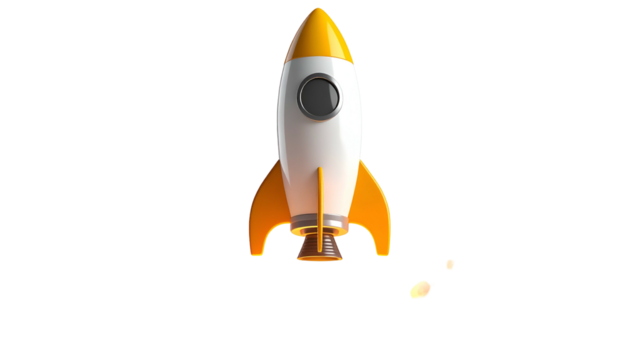Creative concept of rocket launching from laptop computer with fiery exhaust plume representing innovation technology startup and digital growth on white background
