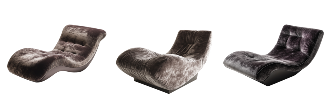 A contemporary chaise lounge with a sleek, curved design and soft velvet upholstery, isolated on a transparent background