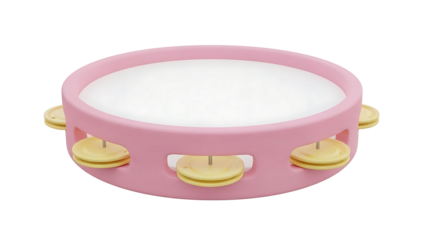 A pink tambourine with gold cymbals sits on a white background.